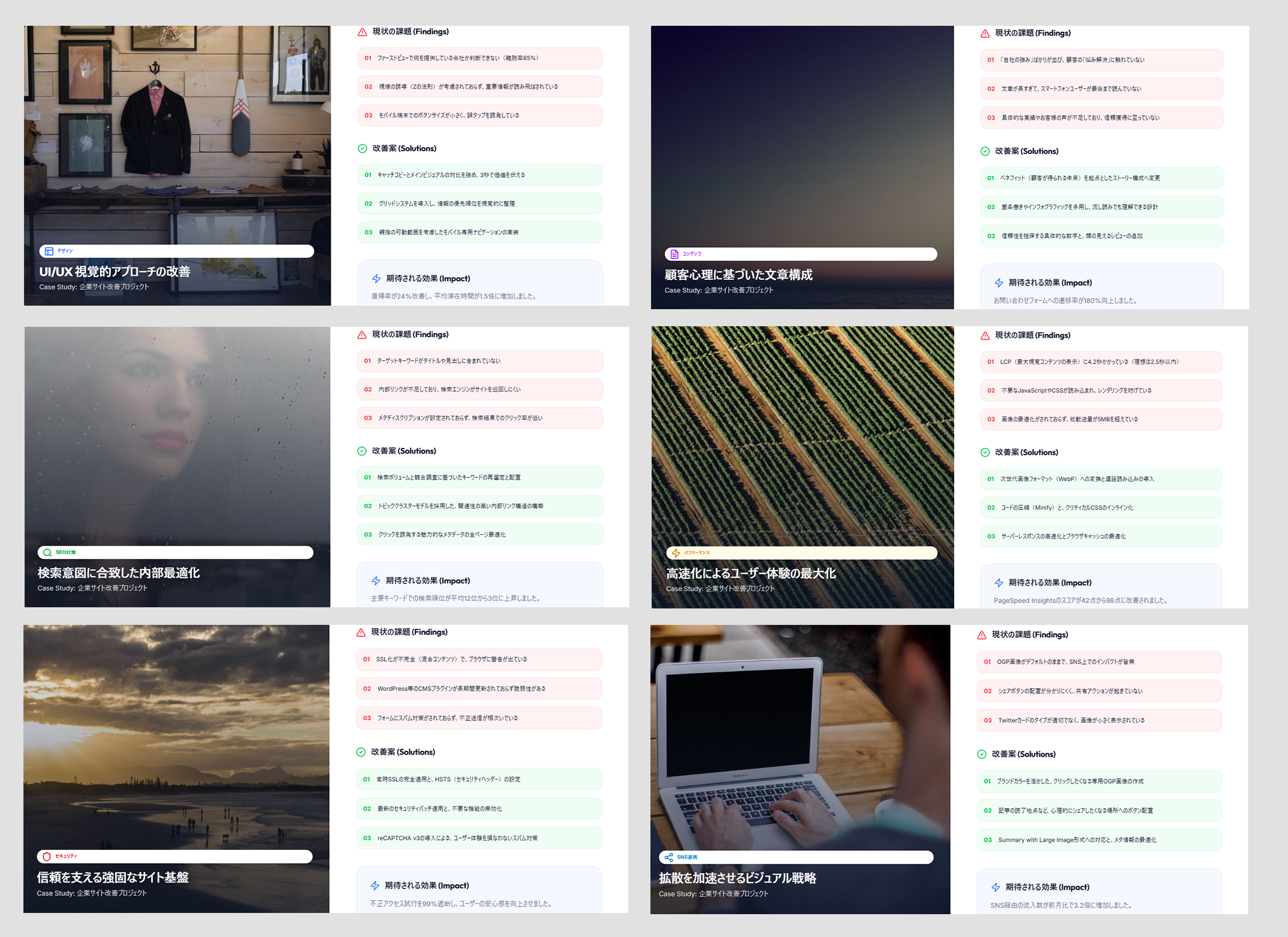ファーストビュー訴求力、ブランド価値との整合性、ユーザー行動を阻害する要因、視認性・可読性の最適化など、サイトの印象と成果に直結する要素を多角的に分析・評価します。